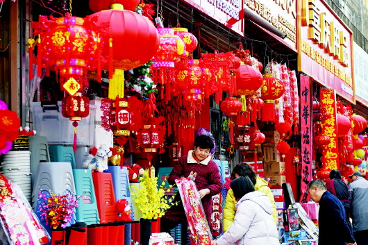 春节临近,天水街头年味浓郁。行道树上灯笼高悬、绢花鲜艳,市民走进年货市场置办年货,处处洋溢着喜庆祥和的节日氛围。