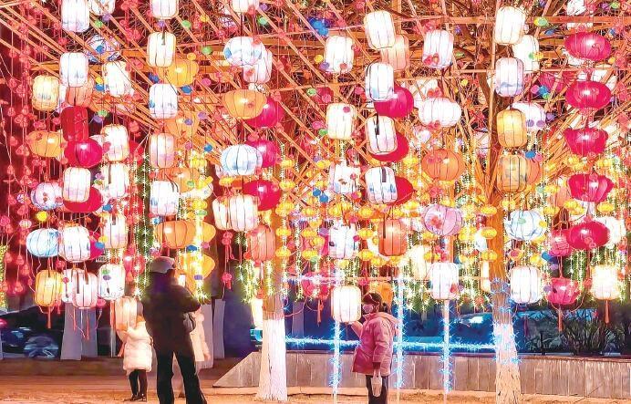 在京都之星商圈、中川商务中心周边,融合企业文化与新区特色的主题灯组格外引人注目。其中,“福灯树”璀璨夺目,吸引市民游客驻足观赏、拍照留念。