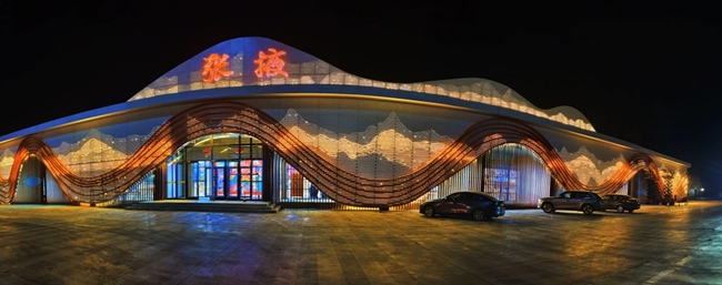 夜幕低垂,“七彩丹霞”主题服务区的外立面率先“出圈”,成为连霍高速上一道独特的夜景。流线型建筑裹着暖金流光,层叠起伏的“丹霞波纹”装饰带,将白日里的七彩地貌揉碎进夜色。“张掖”二字在灯影中熠熠生辉,远远望去,恰似一座“发光丹霞山”。“奔波半宿的疲惫,竟被这抹夜色里的斑斓瞬间消解,这趟归途太惊喜!”自驾路过的陈先生举起相机定格这一美好瞬间。