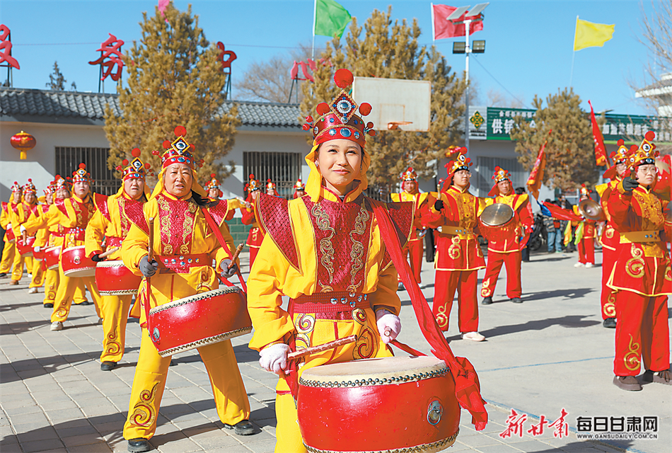 近日,在金塔县东坝镇小河口村,社火队的队员们正在排练,迎接即将到来的春节。新甘肃·甘肃日报通讯员 曹红祖