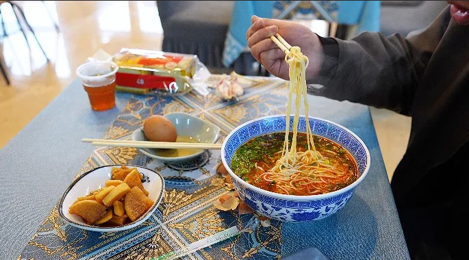 如果说剪纸刺绣是安静的匠心,凉州舞狮是热烈的欢腾,那么兰州牛肉面,就是归乡人最滚烫的年味。兰州南服务区餐厅档口,师傅现场拉面,面团在他手中反复抻拉,瞬间化作粗细均匀的面条。一清(汤)二白(萝卜)三红(辣油)四绿(蒜苗)五黄(面条)——一碗地道的牛肉面端至面前,热气腾腾,香气扑鼻。这不仅让司乘品尝到了最正宗的风味,更让这项百年非遗在旅途中传递出“家”的温度。一位长途货车司机大口吃着面,满足地说:“在外头跑了一年,就盼着这一口呢。吃下去,心就踏实了,感觉真的快到家了。”
