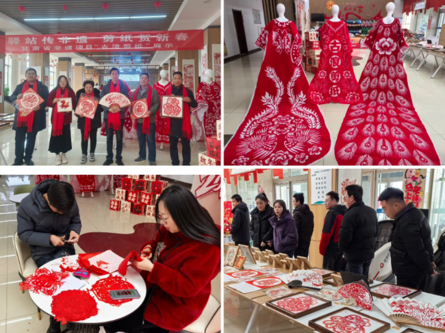 “妈妈你看,这是我剪的小马!”在西和服务区,平日里略显安静的休息大厅此刻热闹非凡,剪纸传承人手把手教过往司乘折纸走剪,红纸翻飞间,福字、窗花、生肖跃然纸上;一旁的刺绣桌前,几位年轻姑娘在老师的点拨下,也饶有兴致地拿起绣针,体验着“穿针引线”的乐趣。这边西和的手工正热,那边土门服务区的红纸已经铺开,省级非遗“古浪剪纸”亮相服务区,上百幅作品从生肖瑞兽到丝路驼影,既有年味,更有陇原风情,传承人现场剪刻,围观的司乘纷纷掏出手机,有人拍下作品发朋友圈,有人干脆卷起袖子试一把,现场成了“非遗体验课”。