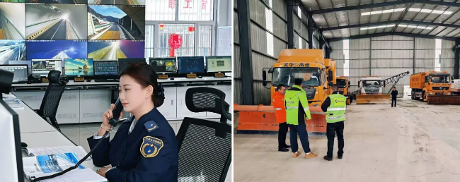 雪情就是命令,保畅刻不容缓。运营公司提前结合气象预警信息与免费通行车流预判,发布气象预警叫应通知单,将预警信息和工作要求直达各路段服务区、收费站、养护工区及救援单位,提前在桥梁、隧道、急弯陡坡等易积雪结冰重点路段、关键点位,预置足量融雪剂、防滑料等应急物资,对除雪滚刷、撒布车、装载机等设备进行全面调试与编组,组建专业应急抢险队伍,全体人员24小时待命。深化“一路多方”联勤联动机制,与属地交警、路政、气象等部门紧密协作,实现信息实时共享、指令同步传达,形成协同作战、共同保畅的强大合力,重点保障免费通行车辆的通行安全。监控指挥中心依托智慧管控平台,开启24小时全天候监测,实时掌握雪情、路况与车流态势,联动高速交警及时疏导缓行路段,通过可变情报板等多渠道,滚动发布“雪天路滑、减速慢行”“保持车距、谨慎驾驶”等温馨提示,全力保障道路通行秩序,确保高位车流状态下路网运行平稳。