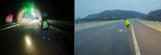天未破晓,巡检队员已整装出发。巡查车灯划破晨雾,队员们目不转睛,仔细排查路面坑洼、碎石、标志标线缺损、护栏松动等隐患;在急弯、陡坡、桥梁、隧道等重点路段,他们下车徒步检查,确保隐患早发现、早处置。
