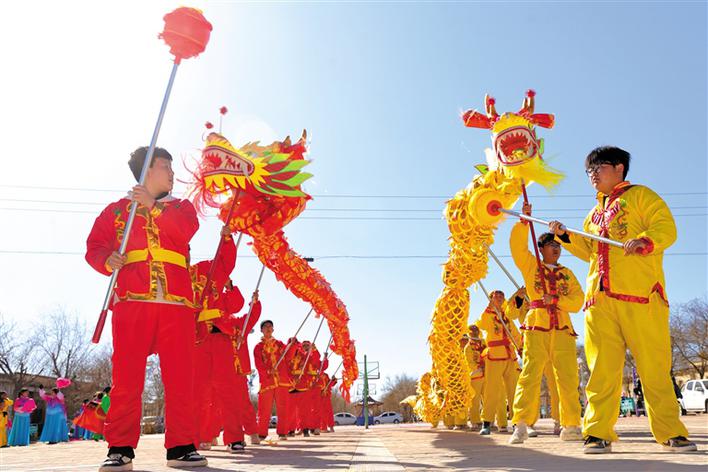 正月里来闹新春,社火演练乐翻天。农历马年正月初四,金川区双湾镇古城村社火队的年轻舞龙者身着盛装舞起长龙。暖阳之下龙腾跃、人欢腾,浓浓的民俗味与新春烟火气扑面而来。 记者 柯玉栋 摄