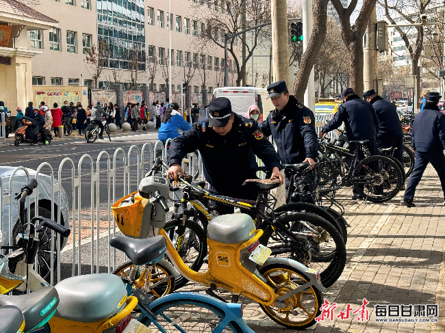 执法人员规范摆放校园周边共享单车。(图片由新甘肃·甘肃日报记者 王聪 摄)