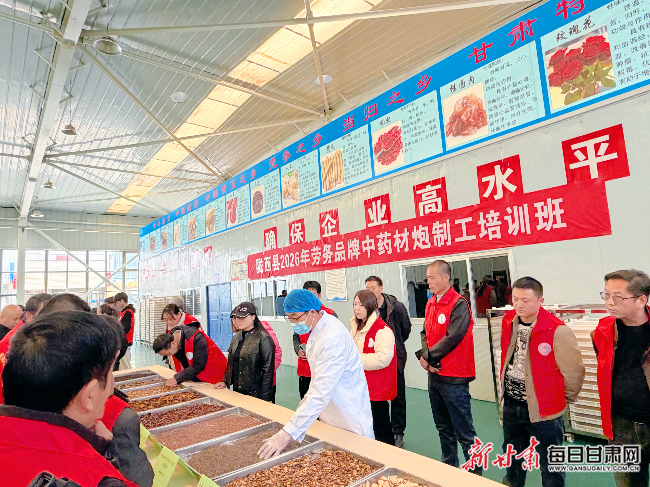 车间之外,陇西县2026年劳务品牌“中药材炮制工”培训班正在这里举办,公司培训教室里人气满满。来自县城及周边乡镇的近50名学员,一边细致聆听老师授课,一边认真记录要点……