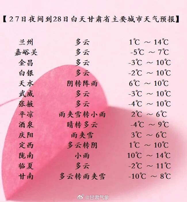 2月27日夜间到28日白天,河西五市多云,祁连山区阴有小雪;甘南、定西、陇南、天水、平凉、庆阳等州市阴有小雪(雨)或雨夹雪,其中甘南州局部地方有中雪;省内其余地方多云间阴,局部地方有小雪(雨)或雨夹雪。