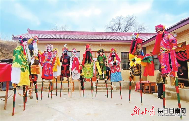 2月25日,在清水县陇东镇赵峡村,社火队员“踩高跷”。新甘肃·甘肃日报通讯员 雷金锋