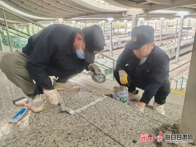 据统计,兰州西客站一共有8005盏灯、9000多级台阶、2万块地砖、24个站台;风雨棚上有432个排水口……经验丰富的老师傅们早已将站房的各项设施“刻”在了心里,同时也摸索出了许多技巧:凭借敲击墙砖的声音,便能判断是否空鼓;检查顶层钢架时,在异常处贴上反光贴就能方便识别;风雨棚上的落水口要在雨季和风沙天气加强清理频次……每当新员工加入,老师傅们便将这些经验传授给新人,共同维护站房“健康”。