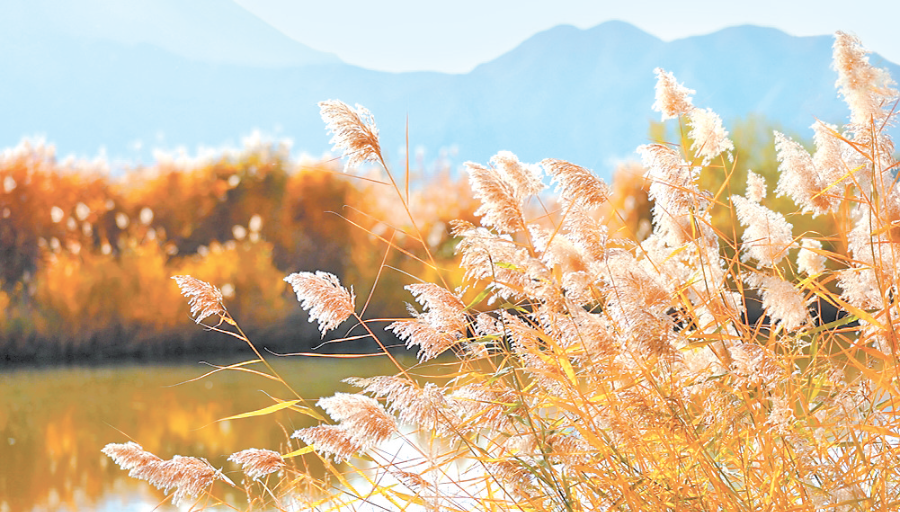 收起望远镜,目光自然回落至脚下的河畔与不远处的水塘,一片耀眼的金黄猝不及防地闯入视线,那是千亩芦苇在绽放独特风姿。河畔与水塘边,芦苇秆纤细却坚韧,顶着蓬松轻盈的芦花,在微风中轻轻摇曳,宛若在阳光下微笑着,向游人展示着独属于冬日的倔强与美丽。一株挨着一株,一片连着一片,远远望去,成片的芦苇宛若燃烧的火焰,照亮了这片静美之地,也温暖了这里的清冷。