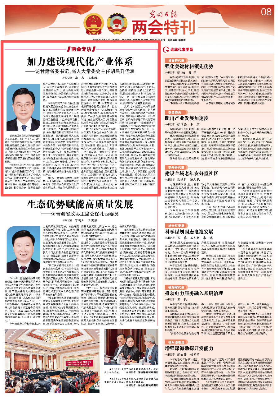 今年的政府工作报告提出,坚持把发展经济的着力点放在实体经济上,因地制宜发展新质生产力,建设现代化产业体系。“工业是支撑甘肃经济发展的脊梁。我们坚持工业强省、产业兴省不动摇,推动工业经济实力和竞争力迈上新台阶。”胡昌升代表说,产业体系现代化本质上是科学技术的现代化,要以科技创新引领现代化产业体系建设。甘肃将继续深入实施强科技、强工业行动,加强重点领域关键核心技术攻关,加快领先技术迭代升级,推动科技创新与产业创新深度融合,引领产业链向价值链中高端跃升;进一步完善教育科技人才一体发展体制,健全竞争性支持和稳定支持相结合的投入机制,大力发展科技金融,引导耐心资本投早、投小、投长期、投硬科技,加强科技成果供需双向精准对接,推动科技成果加速转化为现实生产力。
