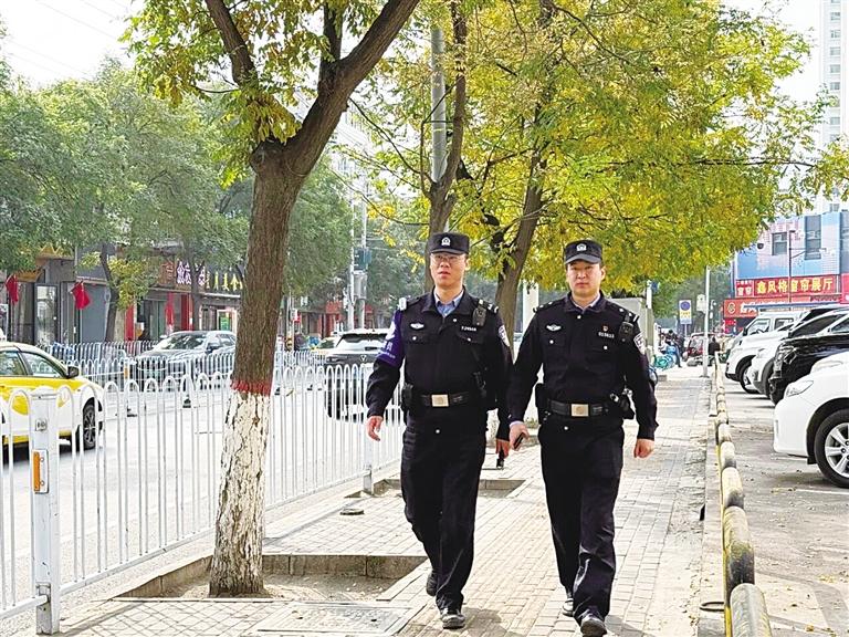 李硕秋(右)和同事在街头巡逻