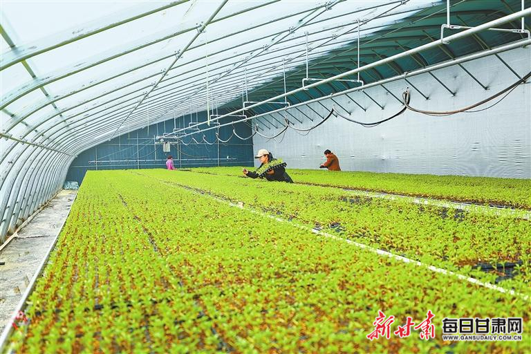 3月19日,武山县洛门镇宋庄村集约化育苗基地工作人员正在挑选搬运菜苗。新甘肃·甘肃日报通讯员 王正平