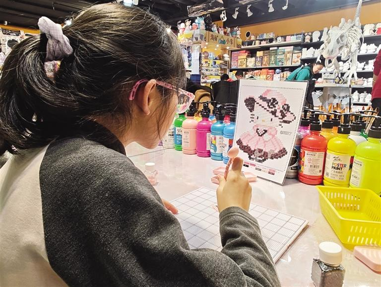 “我们主要做拼豆、银饰DIY和陶艺,也有石膏彩绘、串珠、奶油胶这些项目,基本上当下流行的手工都能体验到。”店内工作人员告诉记者,一站式、多样化的体验,更符合现在消费者的需求,不用跑多家店,就能玩遍多种玩法。