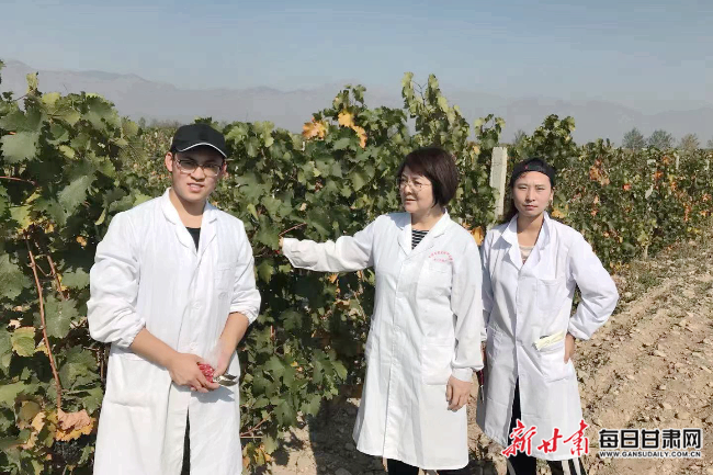 王婧在张掖酿酒葡萄种植基地指导研究生进行葡萄采摘。