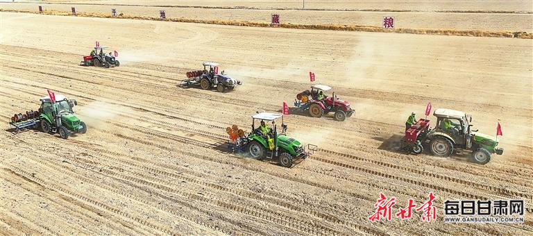 高台县巷道镇殷家桥村绿色高产小麦种植基地,农户使用北斗导航自动驾驶拖拉机牵引的播种、施肥、滴灌带铺设一体机,进行春小麦播种。新甘肃·甘肃日报通讯员 王将