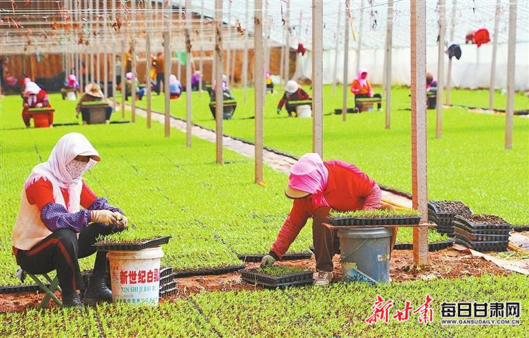 张掖市甘州区党寨镇陈寨村育苗大棚内,工人正在开展辣椒间苗工作,为后续辣椒定植、高产打下坚实基础。新甘肃·甘肃日报通讯员 李自海