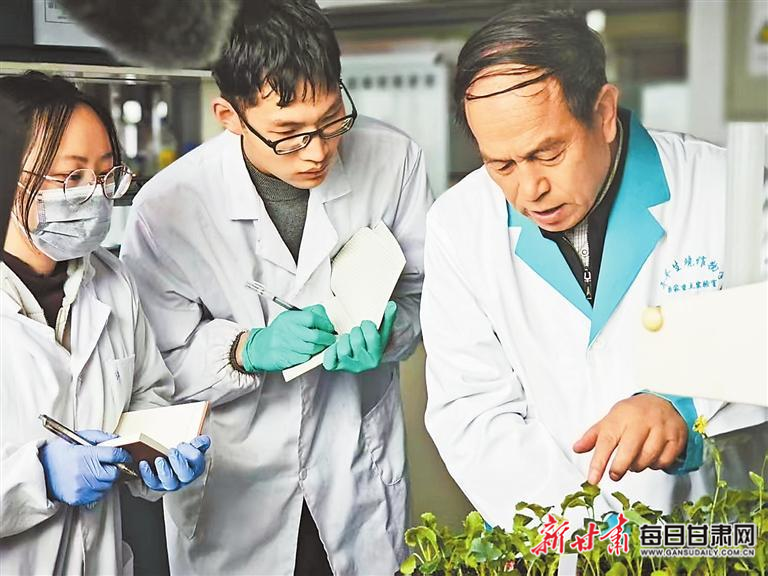 甘肃农业大学教授孙万仓(右一)在指导学生记录实验数据。新甘肃·甘肃日报记者 吴涵
