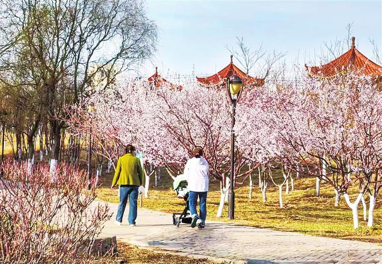 随着气温回暖,新区百花公园的桃花进入盛花期,桃花竞相绽放,吸引众多市民游客前往观赏。图为市民在花径间信步徜徉,感受春日小美好。兰州新区报记者崔盛政 摄