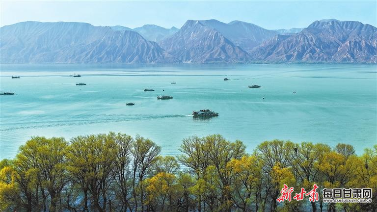 刘家峡水库临夏县莲花镇黄河岸边绿意盎然,吸引游客赏景游玩。新甘肃·甘肃日报通讯员 史有东