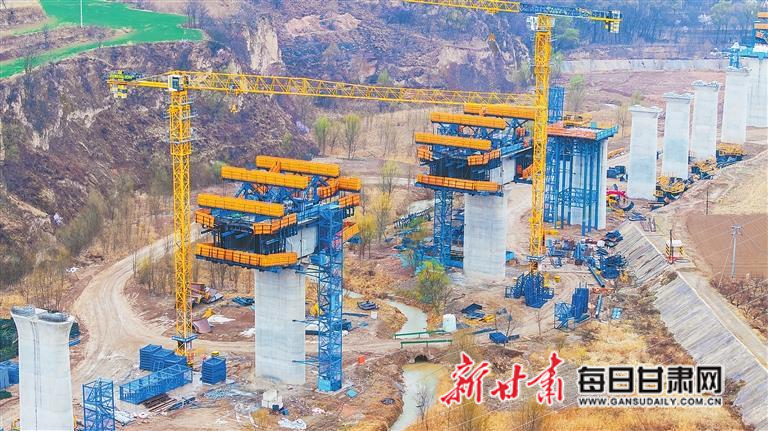 近日,平庆铁路镇原段桥梁主体工程建设进入冲刺阶段,施工人员正在加紧施工。新甘肃·甘肃日报通讯员 陈飞