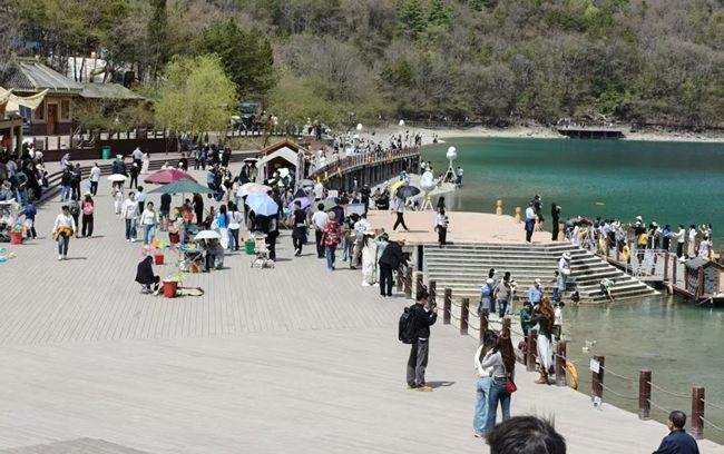 文县天池景区以山水之奇、民俗之韵、服务之暖,成为甘川陕三省游客的清明踏青首选之地。湖区景致清雅,环湖步道游人不绝,湖面薄雾萦绕,尽显灵秀。乘船游湖,湖光山色相融,让游客领略山水胜境、体悟自然神韵。琵琶弹唱、长笛演奏、手风琴表演与火圈舞轮番上演,展现非遗与多元艺术融合魅力;天池村油菜花、山桃花次第开放,游人穿行山野感受春日;洋芋搅团、文县腊肉、花椒鱼等陇南山珍供应充足,烟火气与山水意相融,让“慢游天池”成为消费新亮点。