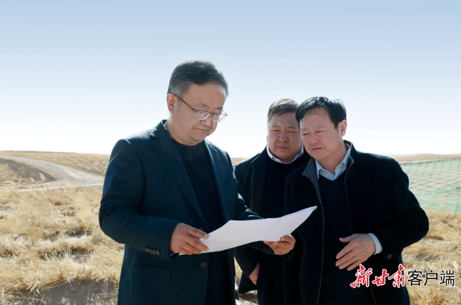 李万权(左一)在民勤县时光廊道调研防沙治沙工作。