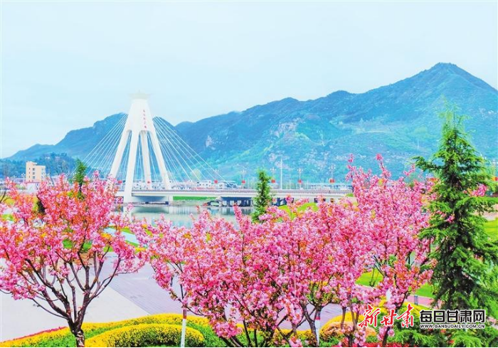 4月8日,成县青泥河沿岸樱花盛开,成为一道亮丽的风景线。新甘肃·甘肃日报通讯员 燕海潮