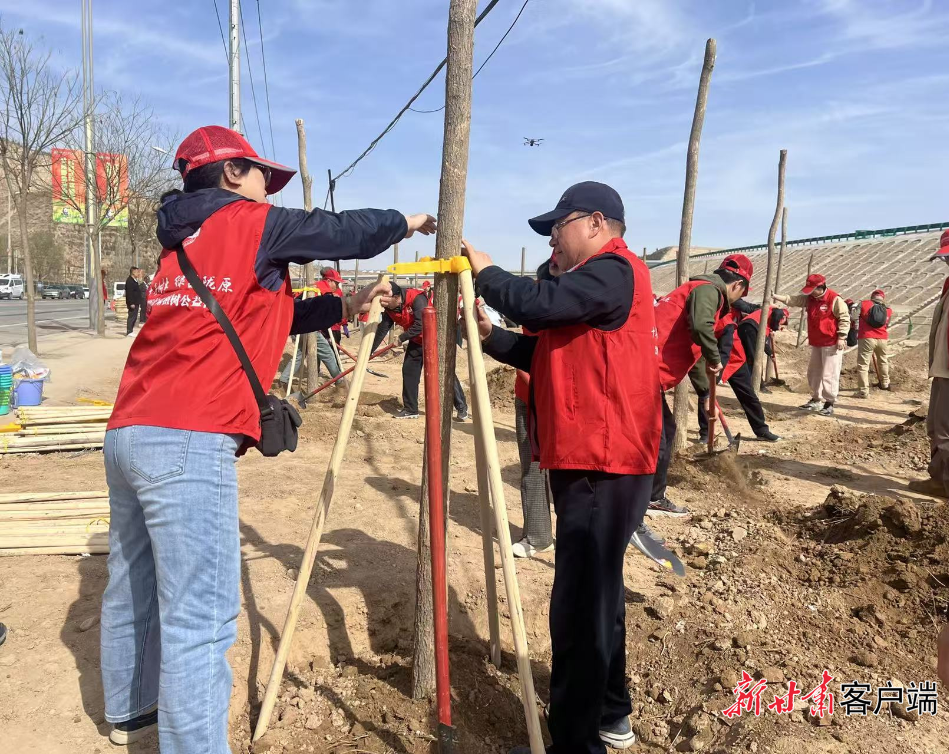 此次植树活动由省委直属机关工委指导,甘肃日报社、甘肃日报报业集团主办,甘肃新媒体集团每日甘肃网、兰州市安宁区人民政府承办。社会各界的志愿者,三五人一组,分工协作,携手植树。挥锹铲土者弓步沉腰,一锹下去,黄土翻涌;扶苗定根者马步扎稳,仔细将树苗对准栽植线;提桶浇水者微微倾斜,清澈的水流缓缓渗入树根。