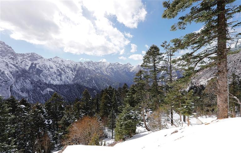 一场春雨过后,宕昌县官鹅沟景区海拔4000多米的雷古山白雪皑皑,银装素裹;山脚下,碧绿的湖水宛如翡翠,山花烂漫绽放,藏羌村寨错落有致。冰雪与春色同框,构成一幅独特的生态画卷。