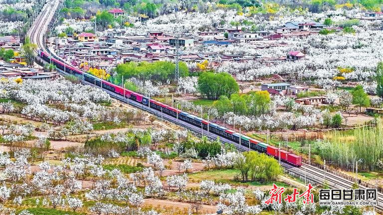 4月12日,货运列车穿行在永登县苦水镇梨花花海中。近日,永登县苦水镇铁路沿线梨花竞相绽放。 新甘肃·甘肃日报记者 田蹊