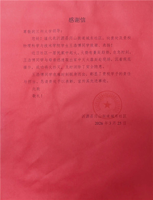 近日,一封社区致兰州大学的感谢信,让该校物理科学与技术学院学生王浩博的暖心事迹走进公众视野。2026年3月3日,元宵夜,放假居家的他偶遇居民楼突发火情,凭借校园培训习得的消防技能,沉着处置初起火灾、转移危险物品,以本能之举守护邻里安全,彰显新时代青年的责任与担当。