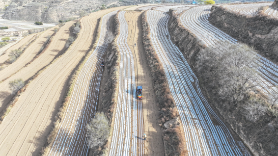 连日来,通渭县碧玉镇抢抓气温回升、土壤墒情适宜的黄金窗口期,全面掀起春耕生产热潮。从川道到山梁,银白色的地膜如丝带般铺展绵延,在春日阳光的照耀下熠熠生辉,勾勒出一幅生机盎然的现代旱作农业春耕图景。