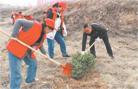 近日,安定区巉口镇抢抓春季植树造林黄金窗口期,组织干部职工、志愿者开展义务植树活动。植树现场,大家挥锹挖坑、扶苗栽树、踩土浇水,分工协作、干劲十足,一株株油松树苗在黄土山坡上扎根安家,为荒山添绿增彩。