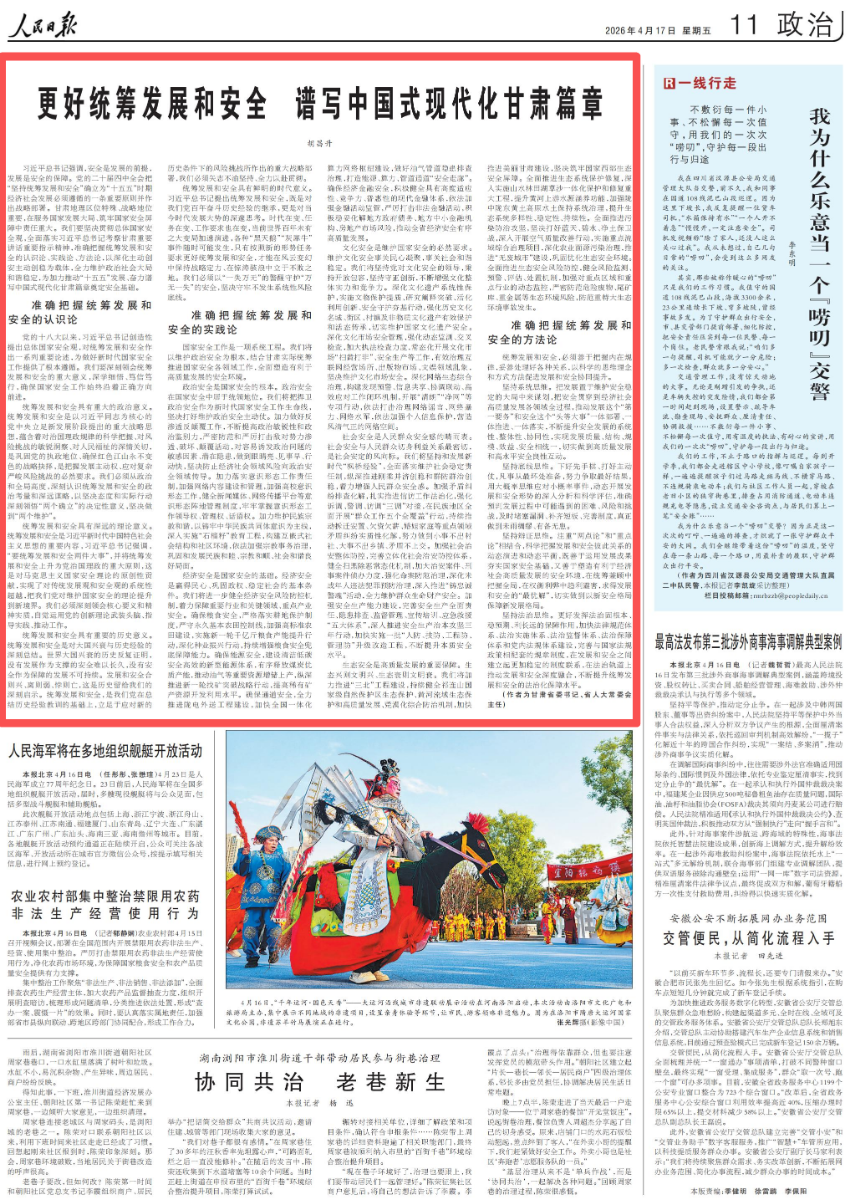 习近平总书记强调,安全是发展的前提,发展是安全的保障。党的二十届四中全会把“坚持统筹发展和安全”确立为“十五五”时期经济社会发展必须遵循的一条重要原则并作出战略部署。甘肃地理区位特殊、战略地位重要,在服务国家发展大局、筑牢国家安全屏障中责任重大。我们要坚决贯彻总体国家安全观,全面落实习近平总书记考察甘肃重要讲话重要指示精神,准确把握统筹发展和安全的认识论、实践论、方法论,以深化主动创安主动创稳为载体,全力维护政治社会大局和谐稳定,为加力推动“十五五”发展、奋力谱写中国式现代化甘肃篇章奠定安全基础。