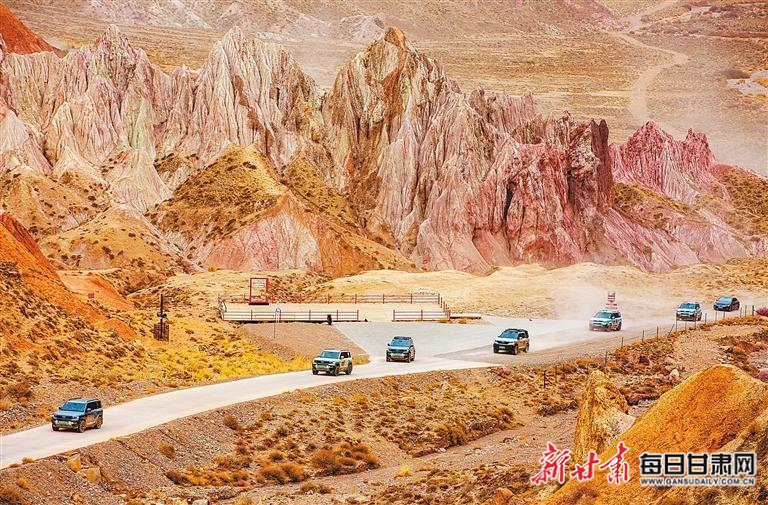 4月18日,来自全国各地的自驾游游客,驾驶车辆进入张掖外星谷星际主题地质公园,观赏火星谷、木星谷、水星谷等景区的壮美风景。新甘肃·甘肃日报通讯员 杨永伟