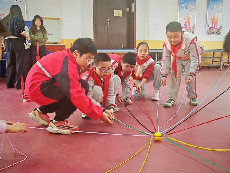 每周五下午,西固区福利西路小学的心理健康课,都是孩子们最期待的“快乐时光”。4月3日,五年级的课堂上,一场“同心塔:我们的默契时刻”游戏火热开展。同学们以扑克牌花色分组,合力用弹力绳稳住小球,“往我这边来点”“慢点稳住”“再来一次”的呼喊此起彼伏。小球掉落时不气馁,成功稳住时欢呼雀跃,在协作与鼓励中,团队默契悄然升温,快乐与自信写在每张笑脸上。