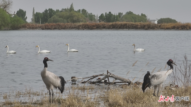黑颈鹤是唯一在高原繁殖和生活的鹤类,而大天鹅是阳关湿地的过境候鸟,四月它们同框现身阳关湿地,属罕见监测记录。近年来,甘肃敦煌阳关国家级自然保护区管护中心系统实施湿地生态修复、植被保护、水源涵养和防沙治沙“三道防线”建设等工程,稳步提升湿地水文调节、生物栖息、物种保育等核心生态功能,区域生物多样性指数持续攀升。