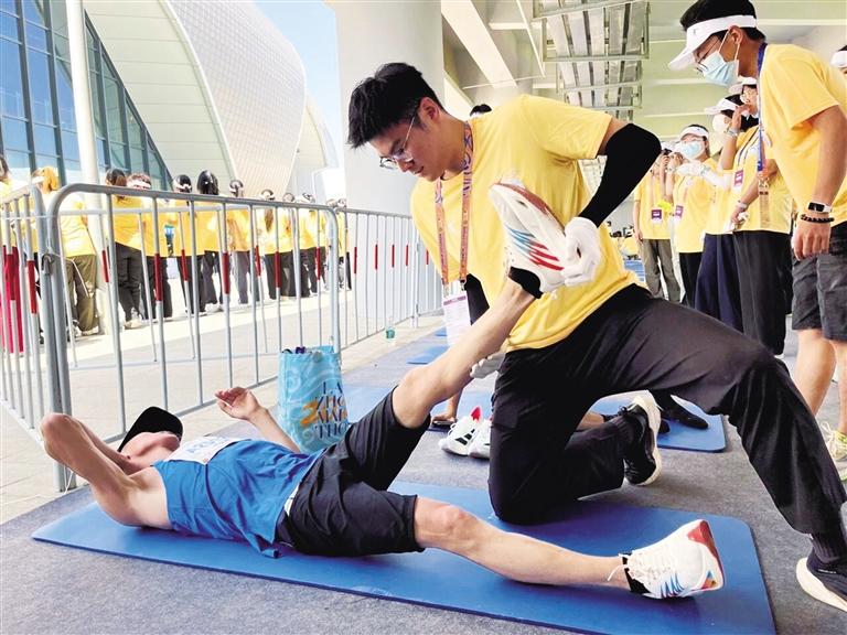 兰精灵·医疗护卫队队员赛后为选手进行拉伸。