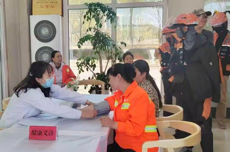 在位于城关镇的户外劳动者驿站,工会特意准备了绿豆汤、西瓜等消暑食品,并邀请医护人员为过往的外卖小哥提供义诊服务,测量血压、检查身体。“跑单累了就进来歇歇脚,喝口水,这里就是我们的‘加油站’。”一位正在休息的美团骑手告诉记者。