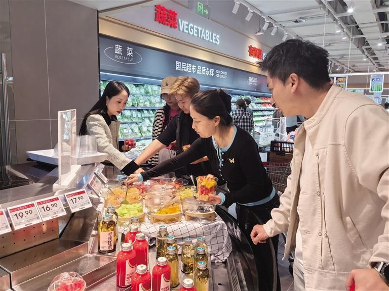 本次爆品节以“高品质、合理价格、独特价值”为核心,推出9大核心爆品与20款当季热卖好物,覆盖出游休闲、健康厨房、换季洁净等场景,从纯牛奶、每日坚果、果汁饮品到粮油米面、洗衣液、纸巾一应俱全。店内专门打造“爆品一条街”集中陈列,橙汁2瓶减5元、纯牛奶2件减10元,更有多件折扣、高频次试吃试饮活动。榴莲、山竹等热带水果同步推出好价,吸引市民驻足选购。