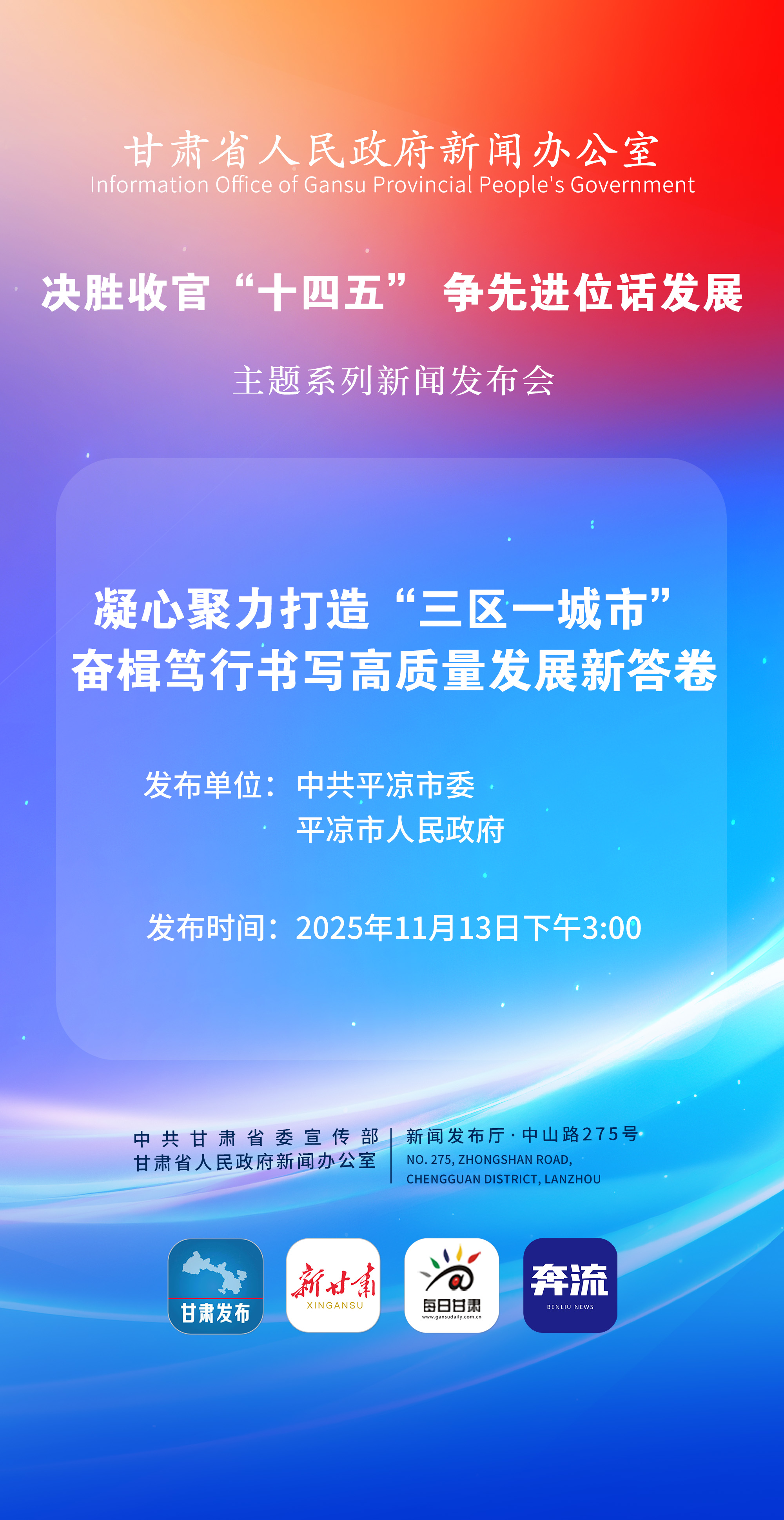 2025年11月13日下午3时,省政府新闻办举行“决胜收官‘十四五’ 争先进位话发展”主题系列新闻发布会第十八场——平凉专场。平凉市委副书记、市长白振海围绕“凝心聚力打造‘三区一城市’ 奋楫笃行书写高质量发展新答卷”主题介绍相关情况。出席发布会的还有平凉市工信局局长杨东虎,平凉市委农办主任、市农业农村局局长陈彦壁,平凉市委宣传部副部长、市文旅局局长唐常宁,平凉市……全文